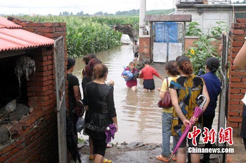 吉林省近日连降暴雨,造成省内多处村庄被淹。图为21日村民趟水返回被淹的家中取物品。 田伟 摄