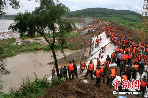 吉林省近日连降暴雨,造成省内多处村庄被淹。图为21日抢险人员在对八一水库堤坝进行加固。田伟 摄