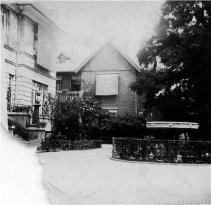 第一张是马厂道吴宅大门,上面铁艺有"吴"的英文打头W字母 。第二张是吴宅喷水池西侧前后两楼的局部照,第三张是临街大门内侧及喷水池。第四张少年身后是两楼之间的天桥通道,这正是吴新田散步从下面经过之处。 ————————————————