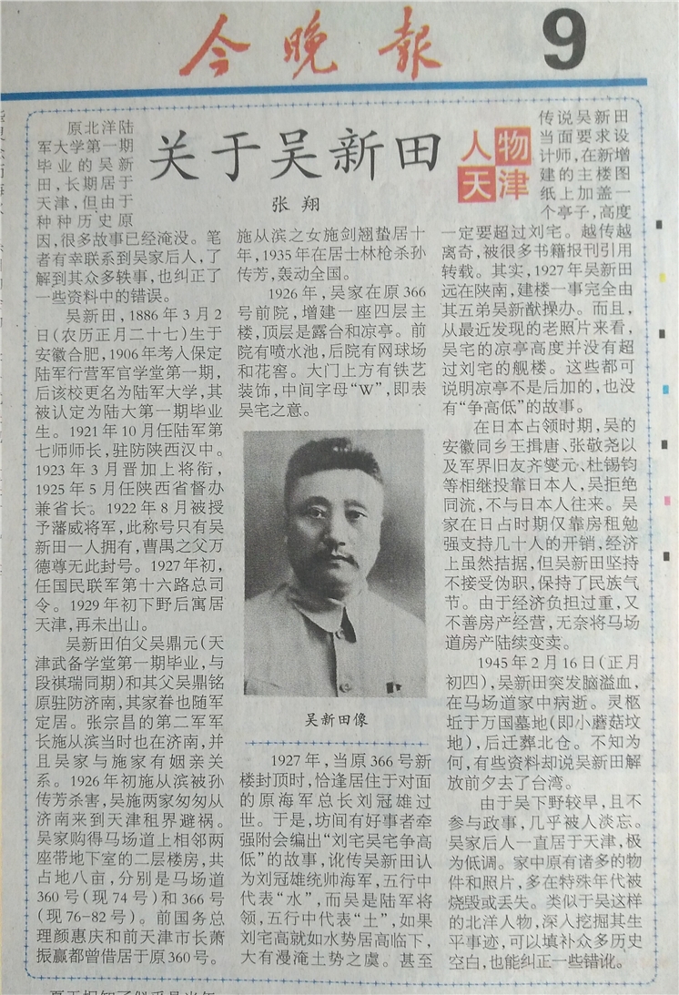1945年初,吴新田病逝于天津马厂道家中。至于有的文章和网络上说他去了台湾。纯属误传。