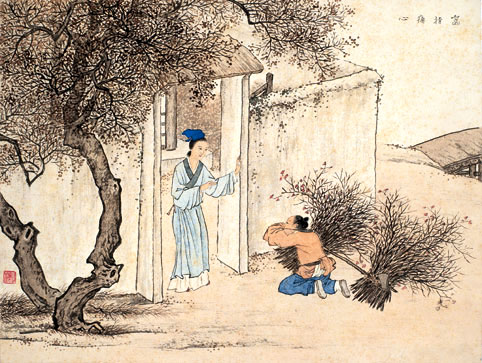 曾参,字子舆,春秋时期鲁国人,孔子的得意弟子,世称“曾子”,以孝著称。少年时家贫,常入山打柴。一天,家里来了客人,母亲不知所措,就用牙咬自己的手指。曾参忽然觉得心疼,知道母亲在呼唤自己,便背着柴迅速返回家中,跪问缘故。母亲说:“有客人忽然到来,我咬手指盼你回来。”曾参于是接见客人,以礼相待。曾参学识渊博,曾提出“吾日三省吾身”(《论语·学而》)的修养方法,相传他著述有《大学》、《孝经》等儒家经典,后世儒家尊他为“宗圣”。