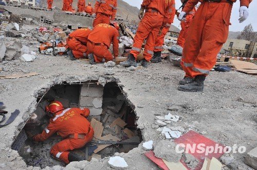 集结在青海玉树地震灾区结古镇的各路救援官兵,4月下旬向所有地震受灾点位和边村远乡纵深挺进,展开最后一次大规模拉网式搜救。中国国家救援队采用顶部钻洞的快速方法深入废墟,确保搜救区域没有任何生命迹象。 中新社发 贾国荣 摄