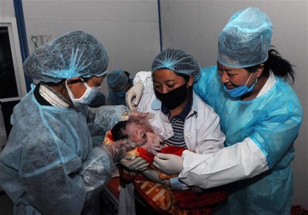 4月19日,青海省玉树州妇幼保健院的护士长尼玛卓玛抱着刚从地震棚里诞生的婴儿。