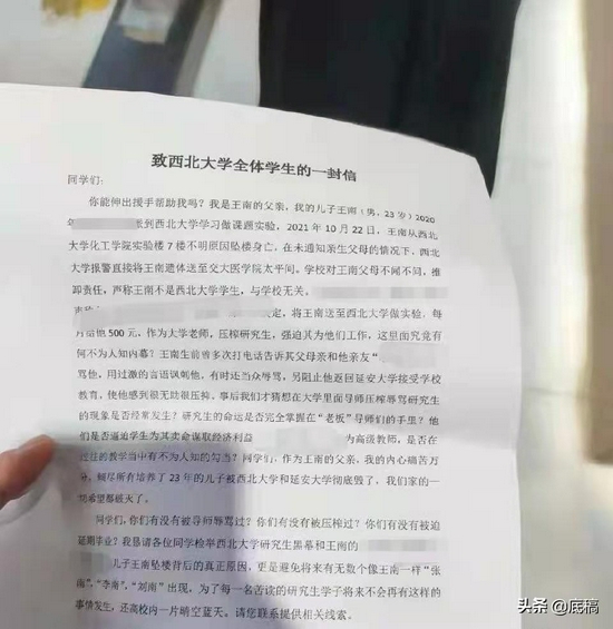 在家人眼中,王南懂事听话,他从来没有让父母和老师操过心。在陕西某高校研究生的第二年,硕士研究生导师吕某,安排其到西北大学交流两个月,陈某为其交流期间的导师,交换期间老师每个月给学生500百元的补助。“结果2个月交换结束后,老师不同意孩子返回原来学校,让其继续在西北大学做研究,孩子就这样直咬着牙坚持了2年。没想到,现在是这样的结果。我的娃中午吃饭还好好的,不可能死亡。”