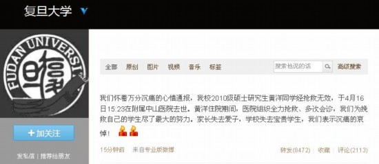 据“复旦大学”官方微博通报:此前中毒入院的2010级硕士研究生黄洋同学经抢救无效,于4月16日15:23在附属中山医院去世。复旦方面称,黄洋住院期间,医院组织全力抢救、多次会诊,我们为挽救自己的学生尽了最大的努力。家长失去爱子,学校失去宝贵学生,我们表示沉痛的哀悼!万千网友悼念呼吁,希望法律能严惩凶手!