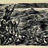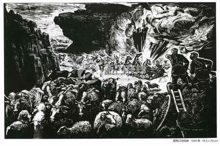 《水灾》创作于1935年,作品表现了30年代黄泛区的严重灾情,揭示了灾区人民水深火热的生活。作者采用线条组合的统一刀法,刻画了挣扎、哭嚎的劳苦民众在肆虐的暴雨和滔滔的洪水面前被卷走、被吞没的危急处境。1941年沃渣担任美协晋察冀边区分会主席,在联大掀起了木刻漫画的创作高潮,边区木刻创作活动走向新的阶段,积极配合抗战中每个阶段的政治、战斗任务,努力使作品与人民的思想意识紧密结合,为抗日军民服务。1942年沃渣的《八路军铁骑兵》获晋察冀边区首次鲁迅文艺奖金获。1942年是日寇对边区的“蚕食政策”更深入、残酷的一年。面对空前的“大扫荡”,边区美术工作者直接或间接地参加了对敌斗争,以各种形式开展抗战文化宣传,唤醒人民,瓦解敌人。《八路军铁骑兵》等作品即时反映1943年,沃渣在看到毛主席《在延安文艺座谈会上的讲话》后,进一步体会到在敌后战斗环境中普及工作的重要性,深刻认识到“革命的文艺应该很好地成为整个革命机器的一个组成部分,作为团结人民,教育人民,打击敌人,消灭敌人的有力的武器,帮助人民同心同德地和敌人作斗争。”他积极深入到群众的斗争生活中去,直接从此时此地的生活中汲取创作素材。面对文艺服务的新对象,沃渣努力创造与之相适应的新形式。他学习民间艺术的形式和风格,创作出与群众情感相通的作品。《把牲口夺回来》创作于1945年,反映日寇的“三光”政策下,八路军狠狠打击敌人,帮老百姓夺回被抢的牛羊。作者激昂壮烈、凝重沉郁的艺术风格,极大地鼓舞了军民的抗日斗志。徜若没有长期深入敌后,在枪林弹雨中的体验和锻炼,是创作不出这样深入人心的作品的。新中国成立后,沃渣以满腔的热情,不断创作出表现新生活、新面貌、大众所喜闻乐见的作品来:《建设》、《学习苏联先进经验》、《参观联合收割机》……,实践着艺术服务社会服务人民的《讲话》精神。