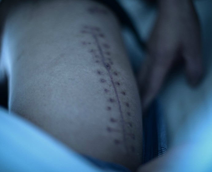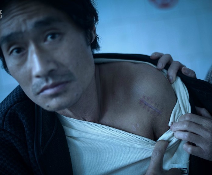 张富民大腿上的缝合线清晰可见。张富民妻子责怪他不该多管闲事,“真是帮了倒忙”。张富民则驳斥妻子,他认为自己能活下来倒是应了“好人有好报”,否则怎么砸中三个人,自己却幸免于难呢。
