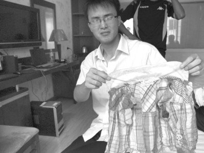 朱昌兴告诉记者,他在医院看见,孩子的全身衣服都湿透了,上面还有沙子,这怎么解释?