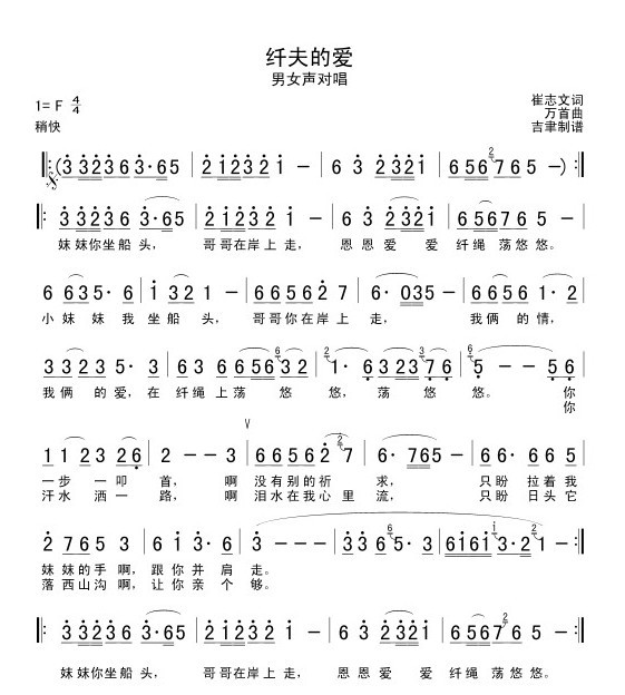 《纤夫的爱》是90年代广为流行的一首歌,它由崔志文作词,万首作曲。此歌首唱于1989年湖北省音乐家协会等单位举办第二届“长江歌会”,首唱者为余凤兰、李天培。但正火起来是在1994年春节之后,于文华和尹相杰录制的同名TV获得了全国音乐电视大奖赛银奖。《纤夫的爱》以通俗直白的语言、朗朗上口的旋律,表达了三峡纤夫与峡江妹子浓烈质朴的情爱。作品采用男女对唱形式,男声粗犷、火爆;女声甜美、委婉,柔情似水。一刚一柔,相映万趣。