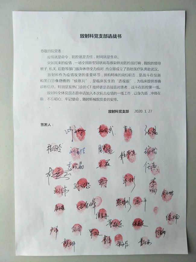 2020年1月27日,沙琳所在放射科党支部党员签署抗疫请战书