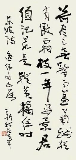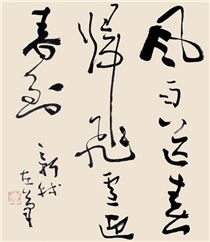 融诸体于一身,熔诸艺于一炉。参以画意,别具章法,有强烈的音乐节奏感,表现出千姿百态,巧拙互用,跌宕有致,纵横捭阖的个性风格,超大特幅,尤体现其雄强气势和时代精神。
