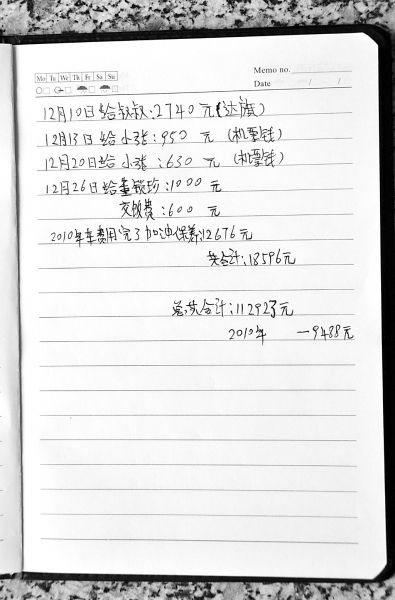 公安局规定,局领导每辆公车年花销不能超过6万元。2010年,郝万忠的车花费7.2万元,于是他自掏腰包12676万元,补上了超出的部分。郝万忠私人账本上2010年记的最后一笔账,就是这笔费用。