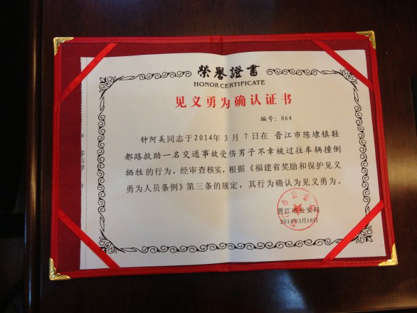 黄建辉政委为钟阿美家属颁发见义勇为证书。我们相信,钟阿美并没有离开,“他”在我们每个人的心里都种下了一颗道德的'种子,而我们要做的就是如何让这颗见义勇为的种子发芽并茁壮成长