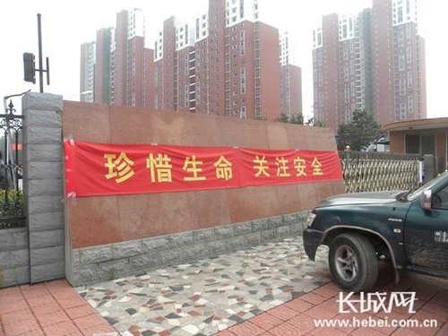 河北大学工商学院生活区门口悬挂“珍惜生命 关注安全”条幅。长城网记者 李艮春 摄
