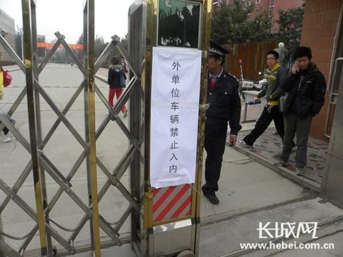 河北大学工商学院生活区门口贴上了“外单位车辆禁止入内”提示。 长城网记者 李艮春 摄