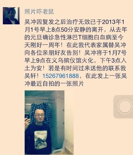 23里_陳磊:吴冲,我高中同窗好友于元旦早上因白血病去世。一路好走多么年轻的生命阿,还有大片的美好未来。生命是那么的脆弱,我们要好好珍惜眼前的一切。大家都要爱护好自己的身体,不要熬夜,要有充足的睡眠,不要不吃饭,养好自己的胃,保持乐观的人生态度,积极快乐的活着。致所有我身边的朋友