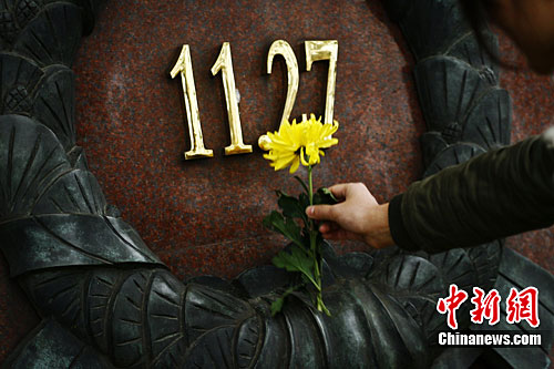 一位重庆市民将菊花献给“11·27”殉难烈士。