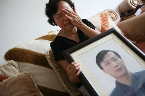死者妻子抱着丈夫的遗像痛哭起来