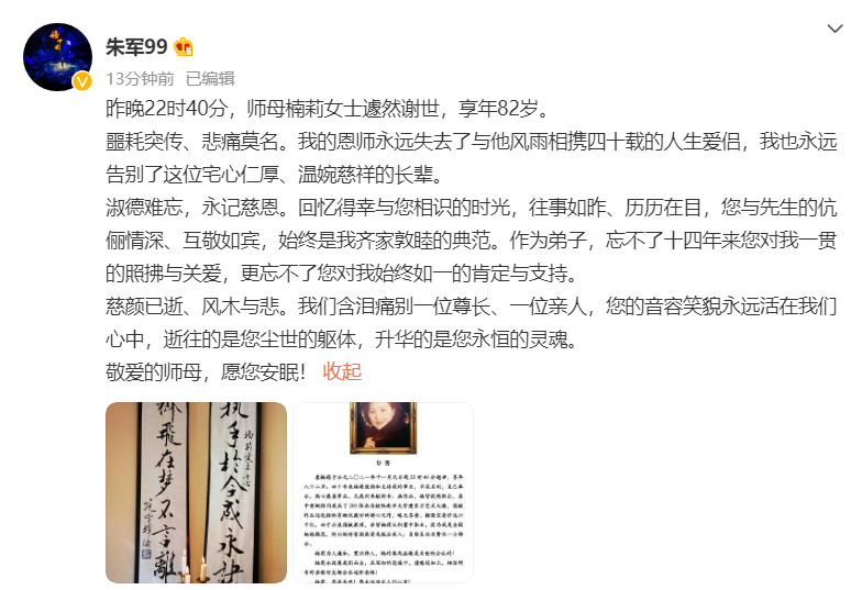 11月10日,朱军发长文悼念自己的师母楠莉。他动情地说道:“我的恩师永远失去了与他风雨相携四十载的人生爱侣,我也永远告别了这位宅心仁厚、温婉慈祥的长辈”。据悉,楠莉女士于11月9日晚上10点40分逝世,享年82岁。