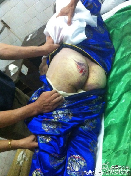 照片里的死者叫刘海滨(51岁,里心镇某彩票店主)。刘海滨被送往医院抢救后,公安机关立即将刘海滨因销售“黑彩”被传唤至刑侦大队的妻子蔡某送往医院配合抢救,并非所说的没有通知家属。经医生查看,死者体表无伤痕,臀部痕迹诊断为褥疮,并非所说的伤痕。其实尸检就能查明死因,为何家属拒绝?
