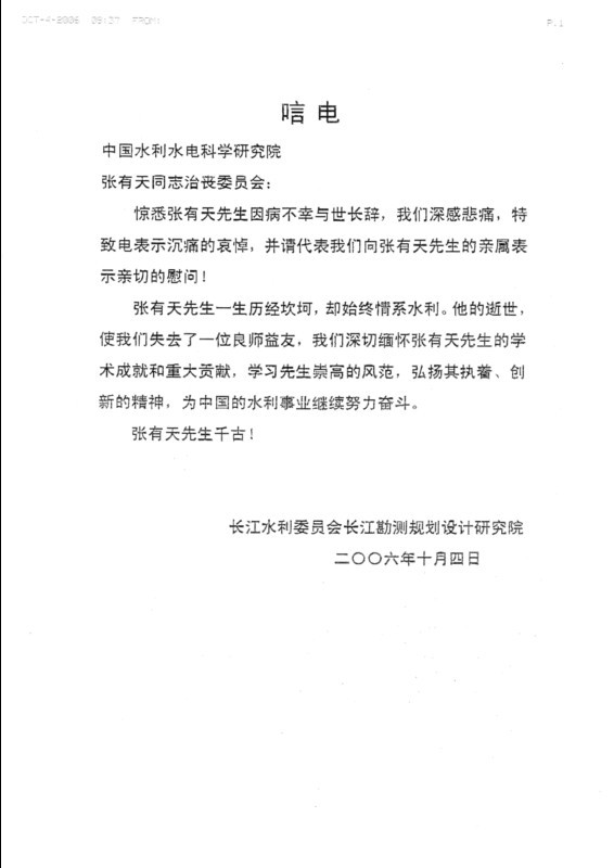 唁电--长江水利委员会长江勘测规划设计研究院
