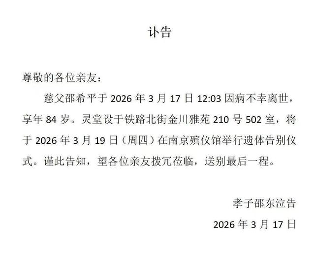 3月17日,邵希平之子发布讣告,于2026年3月19日(星期四)在南京殡仪馆举行遗体告别仪式。
