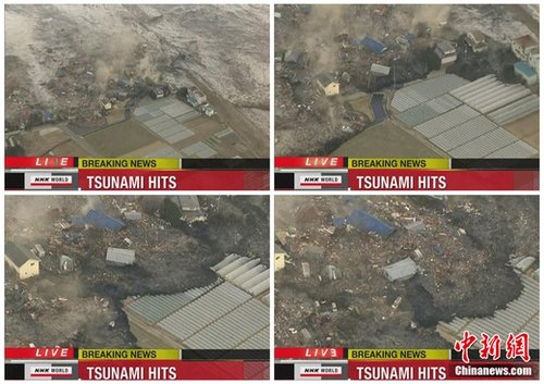 日本近海3月11日发生了强烈地震,首都东京震感强烈。日本气象厅随即发布了海啸警报,称地震将引发约6米高海啸。图为NHK电视台截图显示海啸引发的洪水正在仙台市内蔓延。