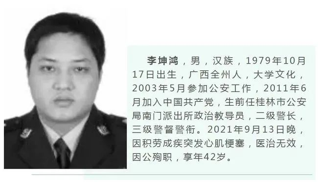2021年9月13日,广西壮族自治区桂林市公安局二级警长李坤鸿同志因积劳成疾诱发心肌梗塞,医治无效因公殉职,享年42岁。