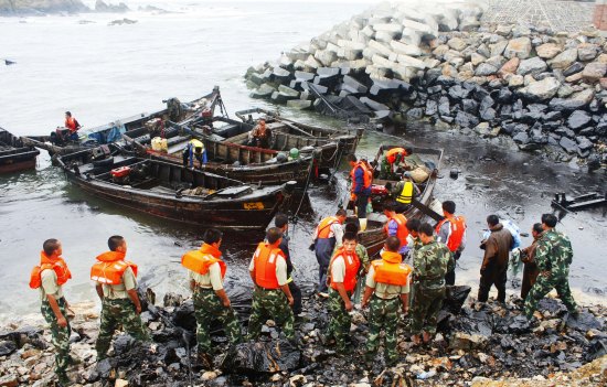 事故成功处置后,张良同志在远程供水编队继续执行监护任务。由于原油泄漏到海面,浮艇泵周围油污、海草等杂物影响吸水效果,远程供水浮艇泵随时需要清污工作,张良同志为确保前方不间断供水,克服身体极度疲劳,克服海水浸蚀,不顾全身沾满油污,每个小时都要深入到海水中清理浮艇泵。