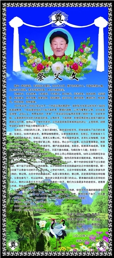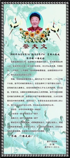 我想对父亲再说几句话: 爸,您的肉体虽然已经消失,但是您的思想、您的教诲、您对我们子女的影响会被我们牢牢地记在心里,并传承下去。我们必须铭记您生前的教诲,老老实实做人,堂堂正正做事。您虽然走了,但您放心,我们会照顾好母亲,更加尊重她,关爱她,让她能幸福的安享晚年。