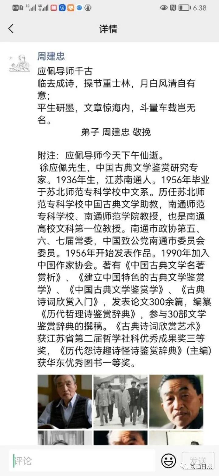 “临去成诗,操节重士林,月白风清应有意;平生研墨,文章惊海内,斗量车载岂无名。”19日晚,听闻导师徐应佩逝世的消息,原南通大学副校长、著名楚辞研究学者周建忠夜不能寐,连夜撰写出这副饱含深情的挽联。