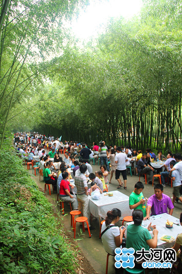 重渡沟风景区营销部经理杨建兵今天(8月17日)下午接受记者采访时说,“万人宴”是重渡沟风景区音乐啤酒儿狂欢节的一个主题,也是为纪念景区创始人马海明先生的感恩宴,所有进入景区的游客都可免费吃。