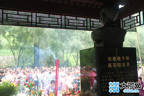 帖子当中,网友以6张图片说话,用餐场面浩大,桌凳摆满景区,桌旁坐满等待吃饭的食客。另有两张现场祭奠的照片。一尊铜像前,密密麻麻全是人头,铜像前的三柱主香正冒着蓝烟,铜像北面“功德载千秋,风范昭日月”几个大字较为醒目,碑文显示铜像主人是马海明,生前系栾川县旅游工作委员会副主任。在铜像附近还悬挂有“弘扬海明精神”、“德及乡梓”等字样的白字黑底条幅,显然是祭拜场面。