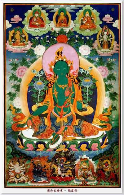 绿度母也是一位善良多情、助人为乐的菩萨。据说供奉绿度母能够解脱人间八种苦难,即狮难、象难、火难、蛇难、水难、牢狱难、曲难、非人难,所以熟称救八难度母。绿度母身色绿色,只有两眼,左手拿一朵莲花,左腿单盘,右腿向下舒展,脚踏在一朵莲花上。藏族传说尺尊公主和文成公主便分别是白度母、绿度母的化身。