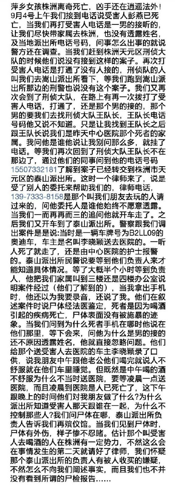 彭燕,1993年出生,江西萍乡人。2016年9月3日中午饮酒后陷入昏迷,4日凌晨被送往医院抢救时已不幸去世,至于“3日下午到晚上这个时段究竟发生了什么”尚不清楚;生前身体伤痕累累,但法医鉴定称“尸体表面无施暴迹象”。留下一个年仅一岁的女儿…