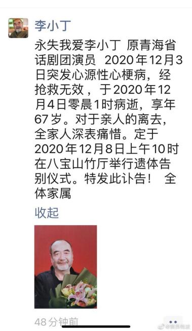 从曝光的图片来看,李小丁的家人用他的账号在平台发文称"永失我爱李小丁,因突发心源性心梗病经抢救无效于2020年12月4日凌晨一点去世,全家人深表痛惜"。