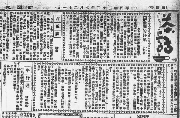 魏中天在案《新闻报》副刊《茶话》连载《狱中生活》书影