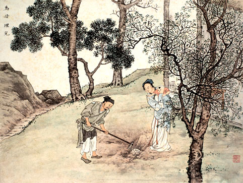 郭巨,晋代隆虑(今河南林县)人,一说河内温县(今河南温县西南)人,原本家道殷实。父亲死后,他把家产分作两份,给了两个弟弟,自己独取母亲供养,对母极孝。后家境逐渐贫困,妻子生一男孩,郭巨担心,养这个孩子,必然影响供养母亲,遂和妻子商议:“儿子可以再有,母亲死了不能复活,不如埋掉儿子,节省些粮食供养母亲。”当他们挖坑时,在地下二尺处忽见一坛黄金,上书“天赐郭巨,官不得取,民不得夺”。夫妻得到黄金,回家孝敬母亲,并得以兼养孩子。