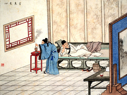 庾黔娄,南齐高士,任孱陵县令。赴任不满十天,忽觉心惊流汗,预感家中有事,当即辞官返乡。回到家中,知父亲已病重两日。医生嘱咐说:“要知道病情吉凶,只要尝一尝病人粪便的味道,味苦就好。” 黔娄于是就去尝父亲的粪便,发现味甜,内心十分忧虑,夜里跪拜北斗星,乞求以身代父去死。几天后父亲死去,黔娄安葬了父亲,并守制三年。