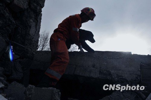 4月21日,中国国家救援队的6只搜救犬全部出动,在青海玉树地震灾区废墟上寻找生命迹象。 中新社发 贾国荣 摄