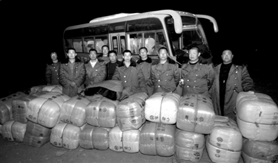 19日凌晨,在玉树结古镇果清村,10位河北保定农民站在卸下的物资前。新华社记者丁海涛摄