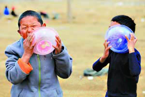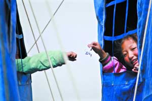 就在这么艰苦的环境下,孤儿们仍然保持着乐观的心态,三五成群地在草地上做游戏。14岁的阿梅和15岁的南松躺在帐篷里翻看几张“飞轮海”的海报。记者问她们最喜欢这个组合里的哪位明星,她们异口同声地说:“喜欢吴尊!”隔壁帐篷里的几个孩子不知道从哪里找来了几张彩色纸,叠起了千纸鹤,在帐篷里飞来飞去,引来帐篷里的其他孩子乐呵呵地抢着玩。