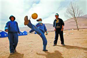 草地上,男孩子们在踢球。地震不能抹杀孩子的快乐。