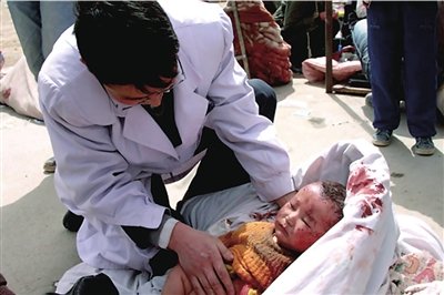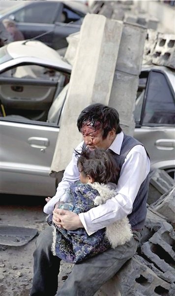 大爱的力量。额头淌血的父亲,目光虽惶恐臂弯却坚固