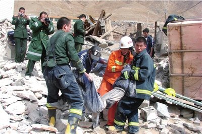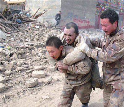 玉树的残躯。废墟中,救援人员将被埋者奋力抬起