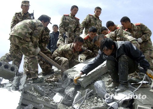 4月14日,武警玉树支队的战士和玉树当地民众共同救援被困的民众。 中新社发 于文群 摄