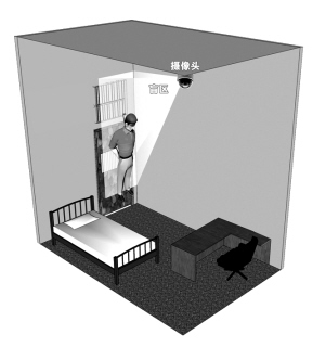 室内东南角离地面3.1米处安装有一斜下视的监控探头,由于这个探头安装位置较高,受监控头视界的技术指标限制,在候问室北侧墙体和通风门窗处形成了约14厘米高、面积约为0.16平方米的监控盲区。邢鲲正是在这一监控盲区上自缢的。