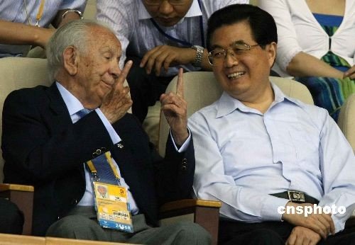2008年8月15日晚,国家主席胡锦涛与国际奥委会终身名誉主席萨马兰奇等到北京首都体育馆,观看北京奥运会中国与美国女排比赛。 中新社资料图 任晨鸣 摄