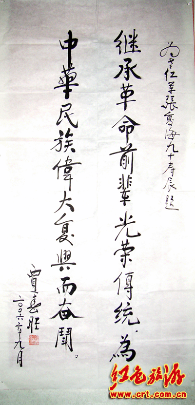 2006年9月,中华人民共和国最高人民检察院检察长贾春旺为老红军张复海90寿辰题词:“继承革命前辈光荣传统,为中华民族伟大复兴而奋斗。”