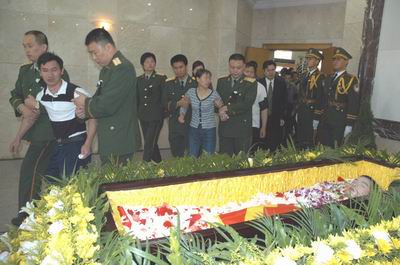 “我们今天怀着无比沉痛的心情,悼念艾伟烈士……艾伟牺牲了,他为人民的利益而死,死得光荣!他的精神将永垂不朽,将激励边防官兵更好地去战斗……艾伟,安息吧!”上午10时,艾伟烈士追悼会在凝重、肃穆的气氛中进行。在多名官兵的搀扶下,强忍悲痛的艾伟父母艾小毛、何四秀首先缓步走到艾伟的遗体前,向自己的爱子作最后的告别。随后,省、市及边防部队有关领导也一一向艾伟遗体告别,并亲切慰问艾伟烈士的父母,赞扬他们为部队培养了一位好儿子,安慰他们节哀顺变,保重身体。
